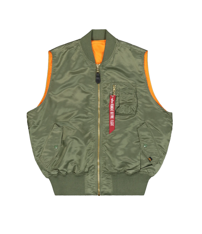Reversible MA-1 Heritage vest crafted from durable flight nylon with a core fit and water-repellent finish. Features utility sleeve pocket with RBF tag, ribbed trims, snap-button pockets, and embroidered Alpha logo for iconic style and function.