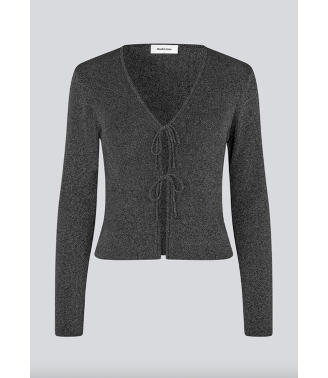 Shimmery silver fitted cardigan with a V-neck, crafted in a soft knit. Features two front tie bands for a stylish closure.