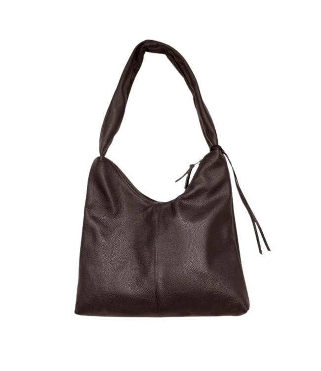 Medium crossbody in dark brown grained Italian leather with a wide brass zipper. Sized for a tablet or small laptop, with cotton lining, inner pockets and signature leather band. A smart, stylish option for work and daily use.