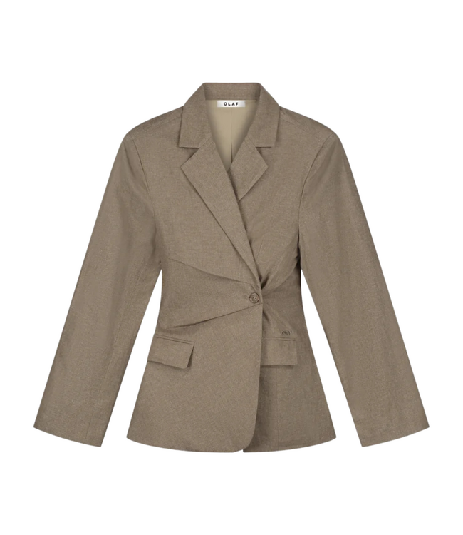 Tailored linen blazer in a refined taupe tone, featuring a new fit with elegant asymmetric detailing and subtle pleats at the button, creating a sophisticated silhouette perfect for elevated date-night looks.