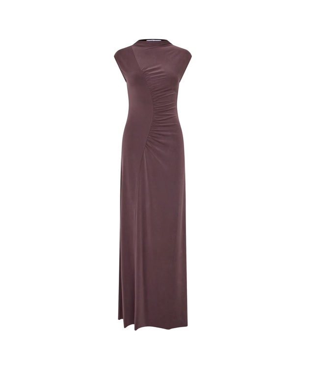A short-sleeve jersey midi dress with a slim fit, straight skirt and high neckline. Finished with soft draped ruching at the front, made from a stretchy blend of TENCEL™ Modal and recycled polyester.