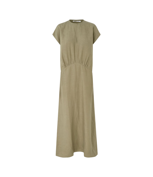 Maxi dress with short sleeves, a round neckline with front slit, and a softly flowing A-line skirt. Gathered waist details create shape while the TENCEL™ Lyocell and linen blend offers a lightweight, breathable feel.