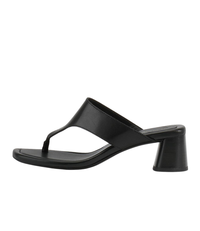 Evie heeled sandals in black leather with a minimalist design and toe strap. Finished with a cushioned, stitched footbed for comfortable everyday wear.