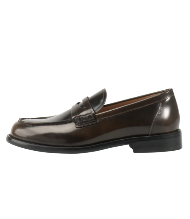 De Linn penny loafer in donkerbruin gepolijst leer is een tijdloze klassieker. Met moc toe-naad, leren voering en dunne rubberzool voor grip en comfort.