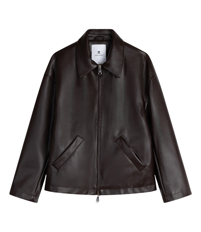 Faux leather jacket by Welter Shelter in a burgundy brown tone, designed to be wind and waterproof. A clean, modern style that offers a practical and durable alternative to real leather, perfect for everyday wear.