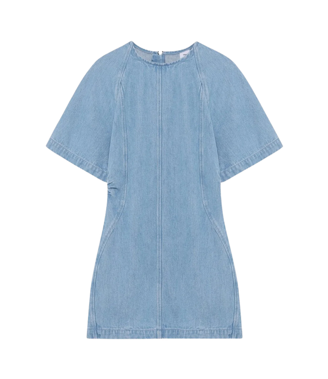 The adana denim dress by won hundred is a light blue mini dress with dropped shoulders and voluminous short sleeves. Gathered waist detailing and cutline construction create a relaxed yet feminine silhouette in soft, lightweight drapy denim.